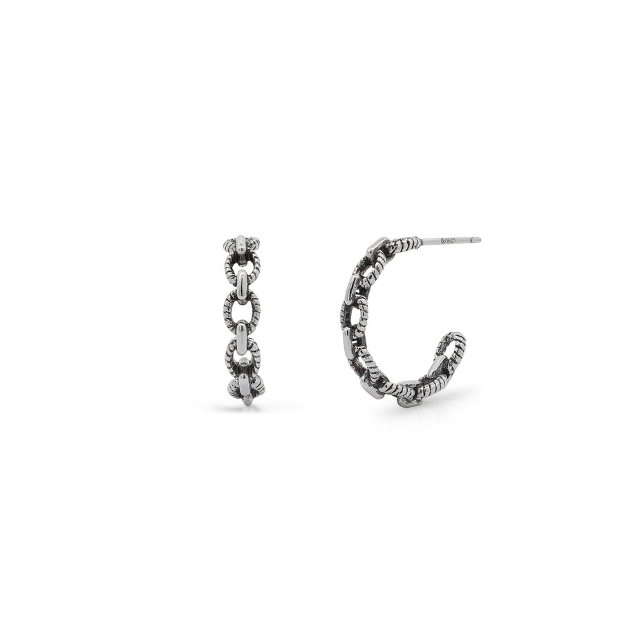 Elevate your jewelry collection with these sophisticated chain hoops, where refined craftsmanship meets contemporary design. Crafted from 925 sterling silver, each hoop features a meticulously textured surface that catches the light beautifully, adding subtle dimension and visual interest. The chain-link construction delivers a modern aesthetic while preserving the timeless appeal of a classic hoop silhouette. Versatile enough for everyday wear yet distinctive enough to make a statement, these hoops transition effortlessly from casual to formal occasions—a premium addition to any jewelry wardrobe.